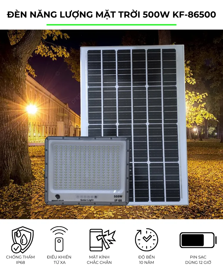 - Điều khiển Remote từ xa : tắt/ mở - hẹn giờ - tăng giảm độ sáng .Thời gian sạc: 5-8 giờ. Thời gian chiếu sáng > 12 giờ