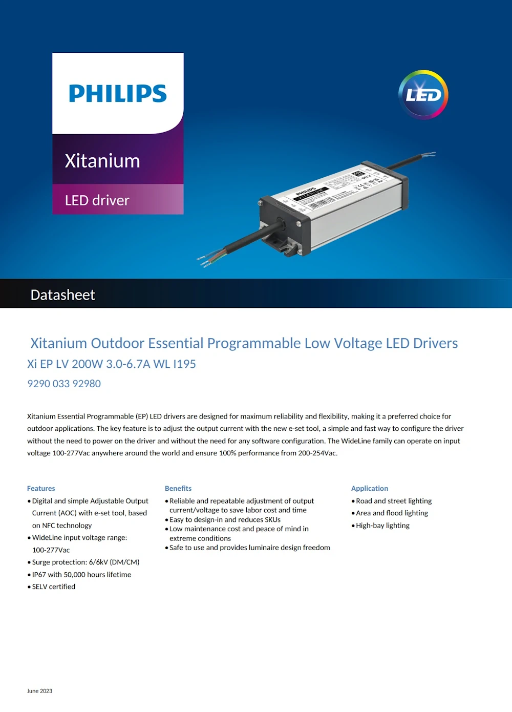 Dễ dàng thiết kế và lắp đặt: Dải đầu ra rộng (24–50 VDC) giúp linh hoạt trong việc kết nối với nhiều module LED khác nhau; thương hiệu lớn như Philips giúp giảm rủi ro bảo hành và bảo trì.