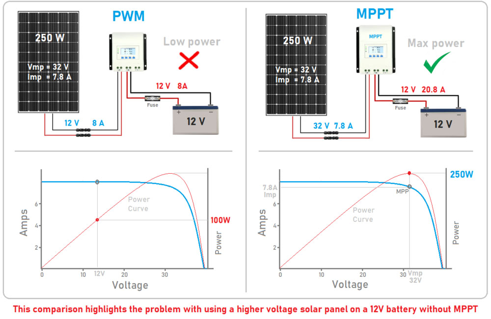 So với sạc PWM, MPPT giúp tăng hiệu suất nạp lên đến 30%. Thiết bị còn duy trì điện áp ổn định, bảo vệ pin trước tình trạng quá sạc hoặc xả sâu